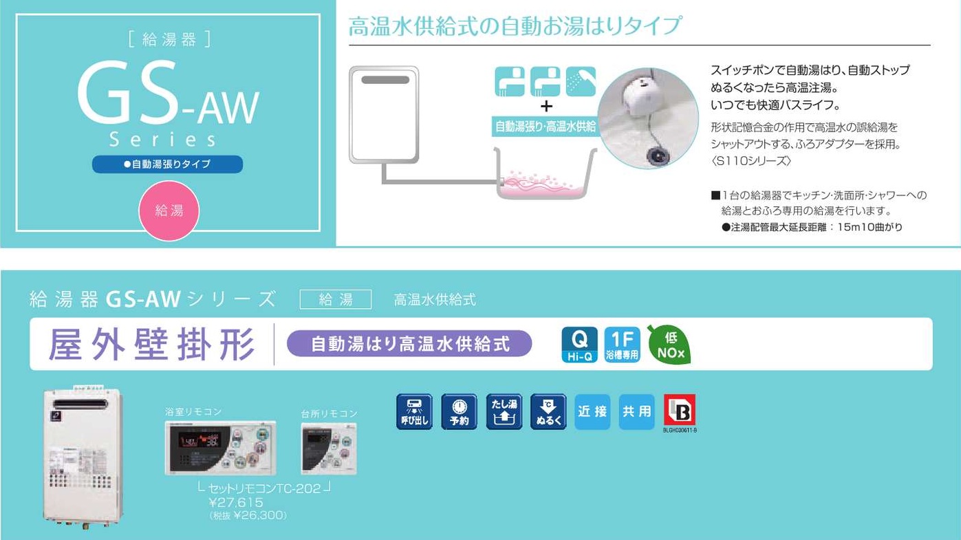 パーパス ガス給湯器 高温水供給式 屋外壁掛形24号 GS-2400AW リモコン別売