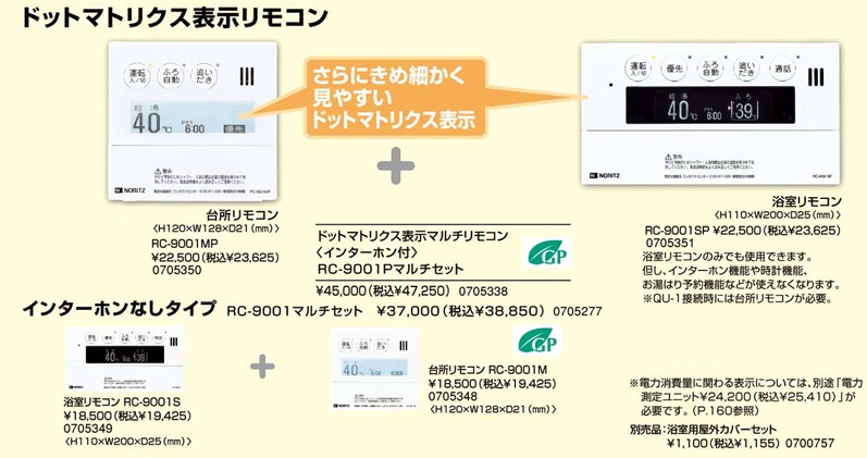 さらにきめ細かく、見やすいドットマトリスク表示リモコン。 ノーリツ ガス給湯器 ドットマトリスク表示マルチリモコン<インターホン付> RC-9001P