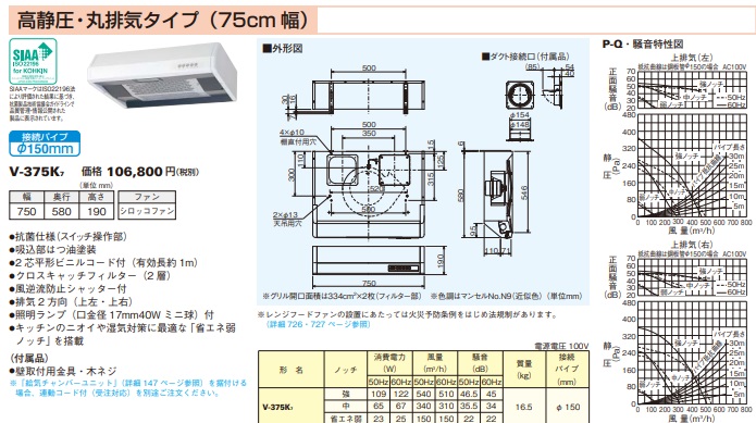 幅75cm 浅形丸ダクト(後・上左・上右・左・右) 三菱 レンジフード V-375K7