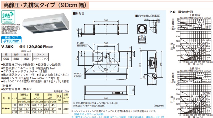 幅90cm 浅形丸ダクト(後・上左・上右・左・右) 三菱 レンジフード V-39K7