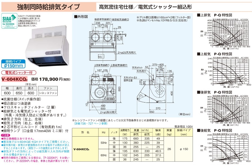 幅60cm全高60cm幕板付 強制同時給排気タイプ 三菱 レンジフード V-604KCQ8